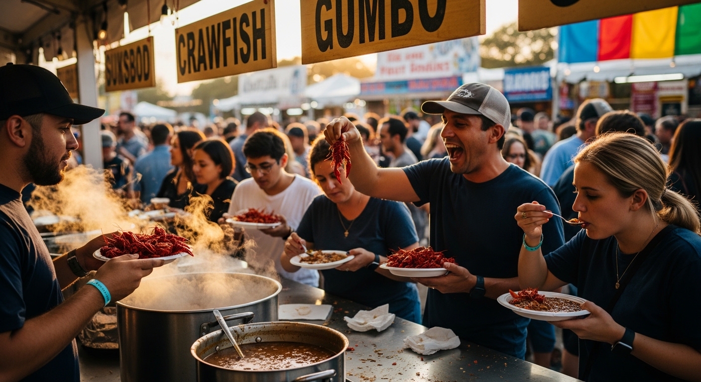 Гастрозоны, арт-рынки, мастер-классы, семейные зоны и тематические павильоны представляют локальную культуру и кухню Луизианы. Можно попробовать традиционные блюда — jambalaya, gumbo, beignets — и купить изделия местных ремесленников. Это часть опыта фестиваля, которая дополняет музыкальную программу.
