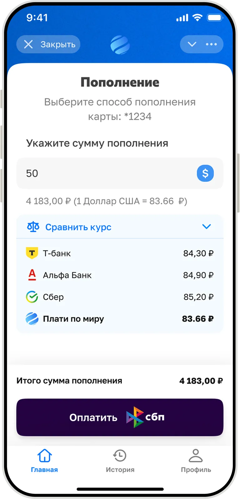 Да, это одно из главных преимуществ нашего сервиса. После выпуска виртуальной карты вы можете добавить её в Apple Pay или Google Pay буквально за минуту. После этого оплачивайте покупки в магазинах, ресторанах и отелях простым прикосновением телефона к терминалу – точно так же, как вы делали это в России. Карта работает в более чем 180 странах мира. При этом не нужно носить с собой наличные или искать обменники – все расчёты проходят напрямую с вашей виртуальной карты, а деньги списываются в долларах или евро, которые вы заранее пополнили рублями через СБП.