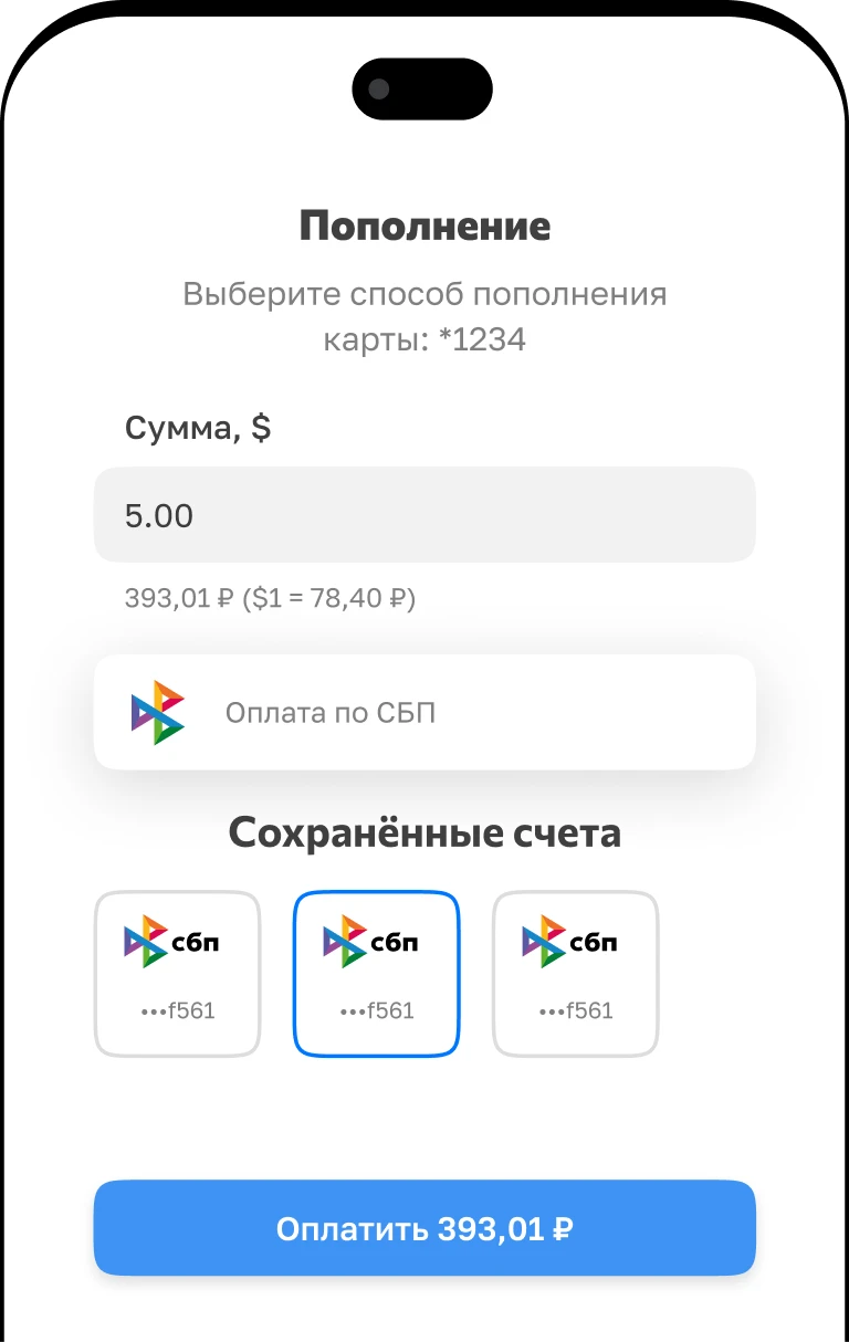 Пополнение происходит моментально. Как только вы отправляете рубли через Систему быстрых платежей (СБП) с карты любого российского банка, конвертация в доллары или евро происходит автоматически, и средства зачисляются на вашу виртуальную карту в течение 1-2 минут. Вы сразу же видите обновлённый баланс в Telegram-боте и можете совершать покупки. Это особенно удобно в аэропорту или в путешествии, когда времени в обрез. Вы можете пополнять карту хоть каждый день небольшими суммами – никаких ограничений по частоте пополнения нет.